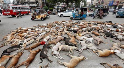 Dead dogs struck by vehicles, their bodies ignored by passersby.